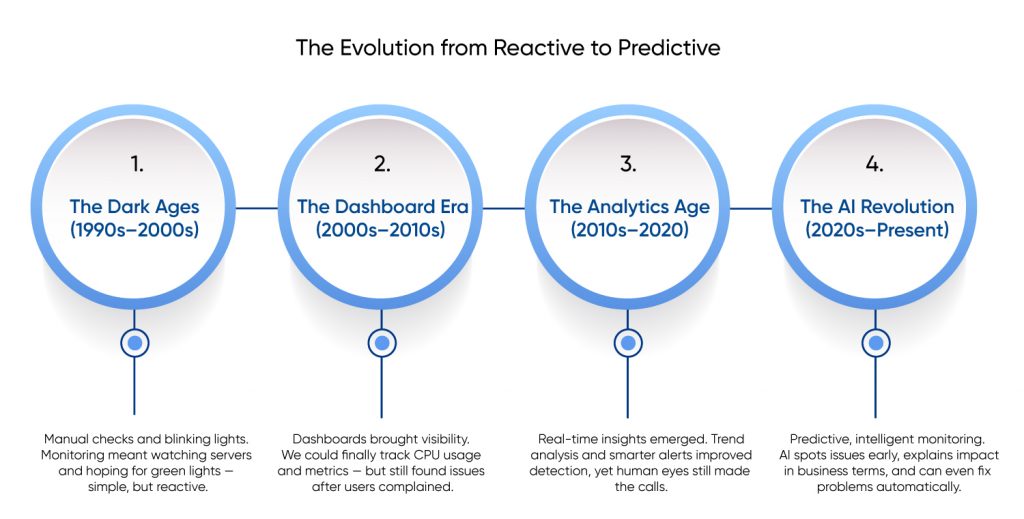 The AI Revolution (2020s-Present): Full-stack observability meets artificial intelligence. Systems predict failures, explain issues in business terms, and often fix problems automatically.